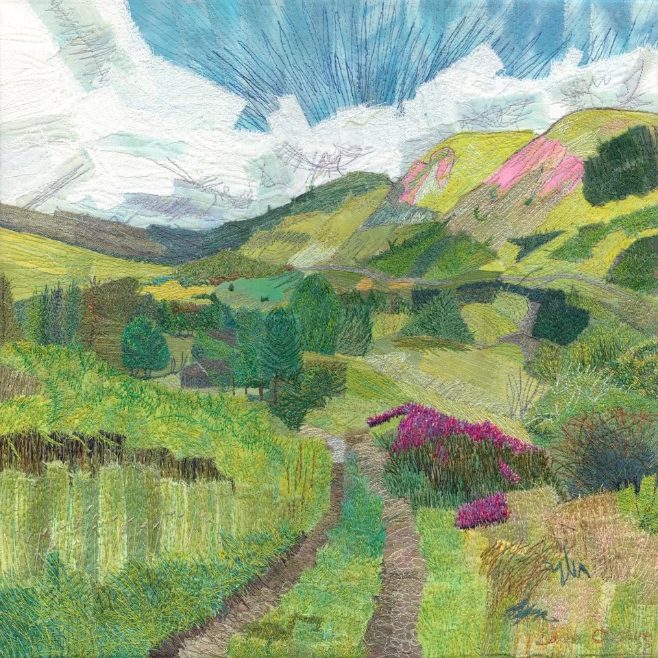 Donna stitches images of a particular time and place, engaging with landscapes that she knows and connects with, using notes and sketches taken on location to inform composition. This process results in powerfully evocative textile art, conjuring the experience of being in the natural environment with cloth and thread